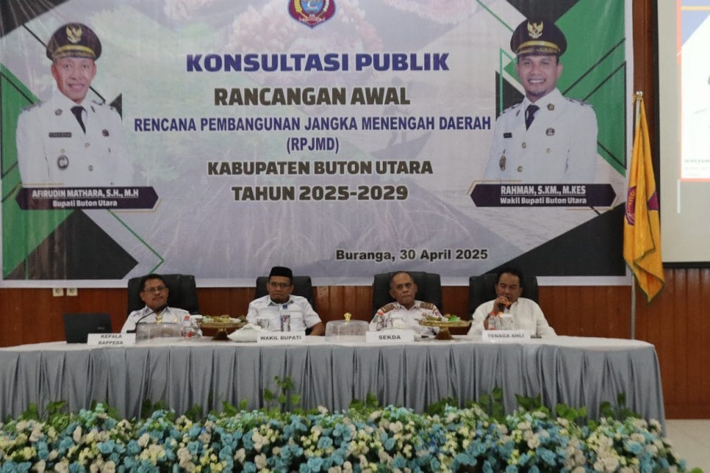 Buranga – Badan Perencanaan Pembangunan Daerah (Bappeda) Kabupaten Buton Utara (Butur) menggelar Forum Konsultasi Publik untuk penyusunan Rencana Pembangunan Jangka Menengah Daerah (RPJMD) 2025–2029. Acara berlangsung di Aula Bappeda pada Selasa (30/4/2025) dan dihadiri oleh berbagai unsur, mulai dari pejabat daerah, akademisi, tokoh masyarakat, hingga perwakilan organisasi.